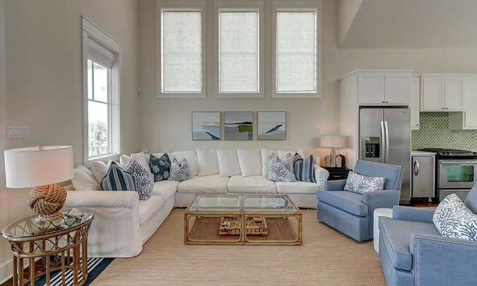 SLEEPING QUARTERS: This home features four bedrooms and three and a half baths. Lots of options with two primary bedrooms, one downstairs and one upstairs, each outfitted with a king bed and private bathroom. The downstairs king suite is decorated in a beautiful blue and white coastal theme. The bunk room is adorable and playful. It sleeps six with a twin over a queen bed and a twin over full bed. Each bed has its own nautical light and plug outlet. The back bedroom – with beautiful beachy fish prints and whimsical palm bedding – is tucked away and also features a king bed. Each bedroom has gorgeous custom draperies with black out lining so everyone can sleep in! Washer and dryer are available downstairs as well. The upstairs primary bedroom has vaulted ceilings with shiplap paneling, a Tempur-Pedic® mattress and a large bathroom with double sinks, separate shower and soaking tub, along with an enclosed water closet.