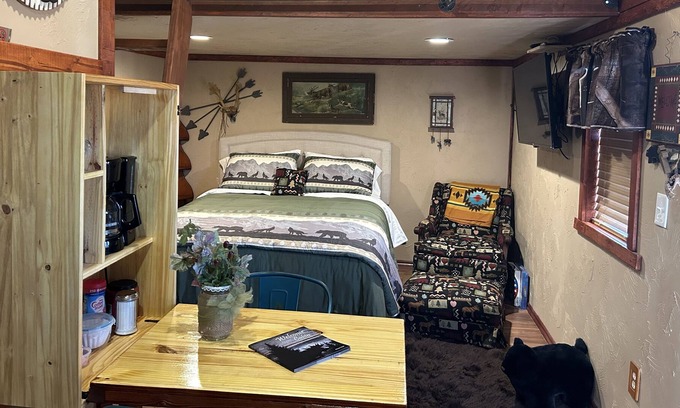 Cozy cabin that is unique and peaceful in the country where you can kick back and relax. The bear cabin offers a private porch with seating, charcoal grill and a fire pit. The is a kitchenette so you can fix a snack or a full meal. More than two staying, no worries, there is a loft with a moveable ladder for was access with a queen floor mattress. If you decide to bring any pets, please include them on how many guest (pets) are staying. We do require a non-refundable pet fee per stay for any pets staying at the cabin.