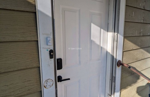 Guest entry is through exterior door that goes into Kitchen, from a small amount of steps. Door is equipped with Keypad access. There is a closet beside the door to hang up jackets and coats.