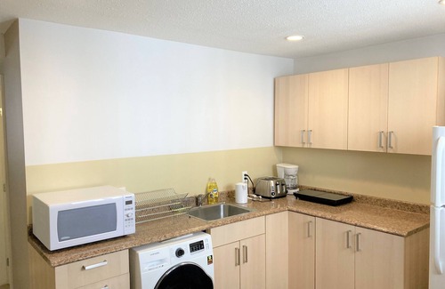 * Kitchen: Microwave, induction cooktop and compatible cookware, in-suite washer and drying rack