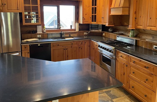 Ski in /Ski out Log Cabin at the base of Kicking Horse Mountain. Sleeps 22 with 19 individual beds. Hot tub, wood burning fireplace and second wood stove, Boot Room to store and dry all your gear, main floor master with ensuite. 4 bedrooms upstairs with 2 full bathrooms. When you enjoy your stay here the place will look entirely different. $100,000 of reno's being done and all new, high end furniture. Quartz counters, viking gas range, new huge work station sink, new dishwasher. Starlink with great internet.