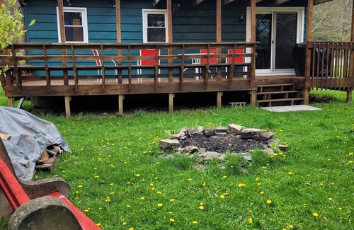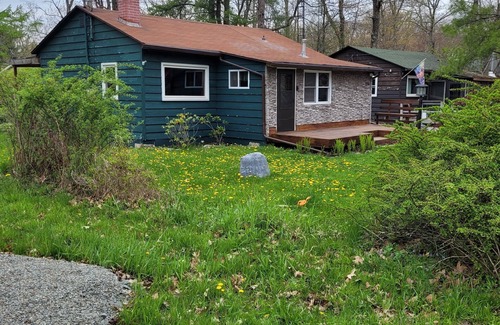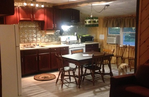 Our pet friendly cabin features beautiful interior channel pine siding, vinyl flooring, rustic log accents and tin kitchen back-splash. That just names a few of the highlights that add to a Black Bear theme we have created. Castle patio doors lead to a large deck running the length of the building and overlook a frog pond. The area is frequented with Black Bear visits, hence it's name. The location is in the heart of 23,000 acres of Delaware State Forest and is Adjacent to Promised Land State Park offering, Swimming, Hiking, Mountain Biking, Hunting, Snowmobiling, all from your front door, the list goes on!