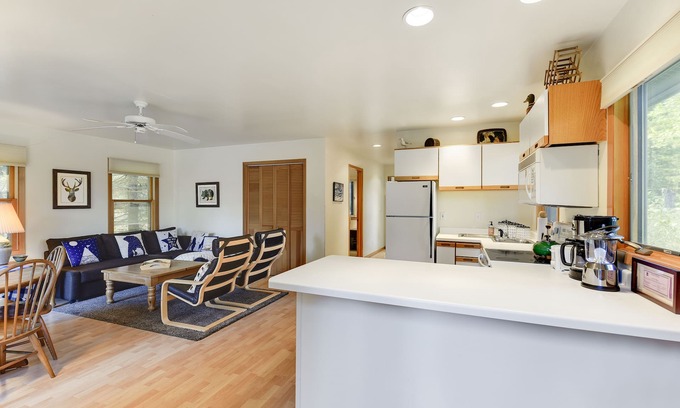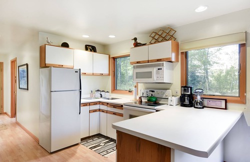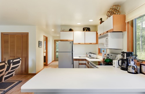 Cozy Cabin welcomes you with sunshine, a fully stocked kitchen, a wood-burning stove, a pullout sofa for additional guests, and more!