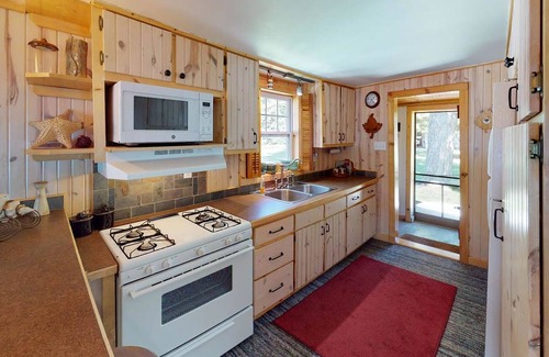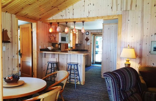 Now inside the cottage, you'll meet the comfort of white-knotty pine everywhere. Pine adds a rustic and cozy ambience that can't be beat while reading by the stone fireplace. Vintage and homemade decorations add a dash of local charm.