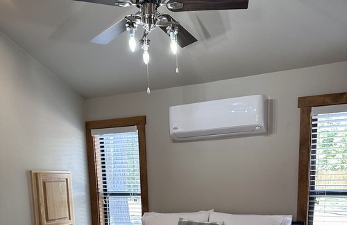 The Grand Cabin offers a cozy stay for two in its one bedroom, one bathroom cabin. Relax on the couch with a Faux fireplace that gives off heat and light, Wifi, TV with streaming ability and a fully stocked kitchen with a full size fridge, microwave, toaster oven, and utensils.
