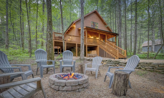 Find true tranquility at this 2-bedroom, 2-bath vacation rental cabin, tucked away along Holly Creek in Chatsworth, GA. Adventure awaits in the surrounding Cohutta Wilderness, while nights promise dinners on the deck, laughter around the fire pit, and peaceful soaks under the stars. Enjoy rustic relaxation at this North Georgia getaway with a welcoming combination of contemporary comfort and classic cabin charm.