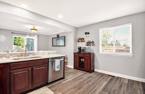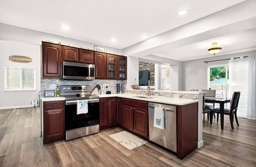 Step into a peaceful retreat designed to help you truly unwind. This newly remodeled home features modern, elegant finishes that feel both upscale and inviting — creating a calm and sophisticated atmosphere from the moment you walk in. With inviting, thoughtfully furnished bedrooms, a fully equipped kitchen with upgraded appliances, high-speed WiFi, and in-home laundry, the space offers everything you need for a relaxing and restorative stay.