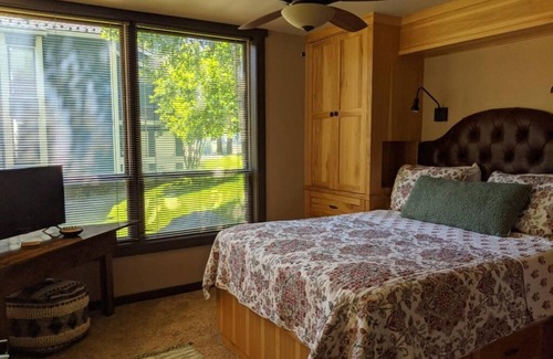 In the summer time, this condo is located right on the 9th hole of the Meadow Creek golf course and less than 30 min from three other courses. The is a heated communal pool with a local bar/restaurant attached and a nearby pickle ball court. The resort has its own private pond, perfect for paddle boarding/fishing. This condo/resort is often referred to as one of the best hidden secret in the area. Feels secluded and discreet, yet not far from all of the action.