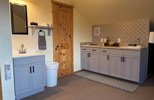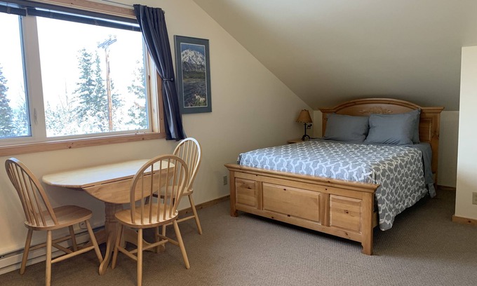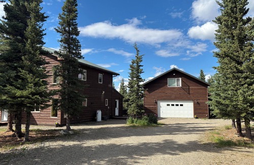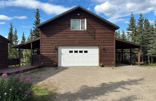 Stay in comfort in the cozy Lynx Den. This second floor suite has amazing open views above the trees facing north for prime aurora viewing in winter and exceptional scenery year round. Den includes a kitchenette and private bathroom with shower. The property is located at the end of a road in a quiet neighborhood on just over 2 acres.