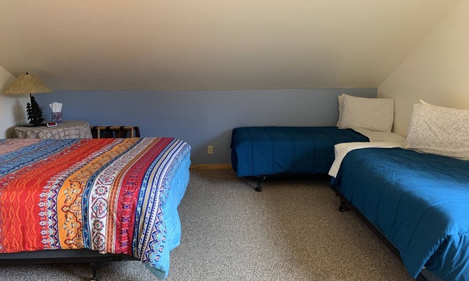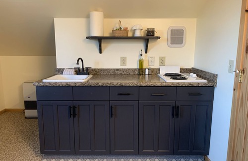 This one room den has one queen bed and two twin beds with sleeping space for up to 4 people. The kitchenette features a large mini fridge with freezer, microwave oven, toaster, coffee maker, 2 burner stovetop, pots & pans, and plates & glasses. Private bathroom with shower and fresh towels are provided.