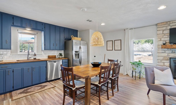 A cozy getaway not too far from major cities like Cedar Park and Marble Falls! Located right on Flat Creek, you are only a short drive to Lake Travis and Flat Creek Estate Winery and Vineyard. Peaceful, quiet and quaint with plenty of room to spread out and have your own space. The patio has plenty of room for relaxing and eating outdoors anytime of the day. Come get away!