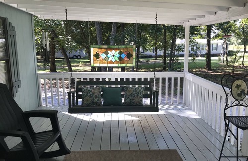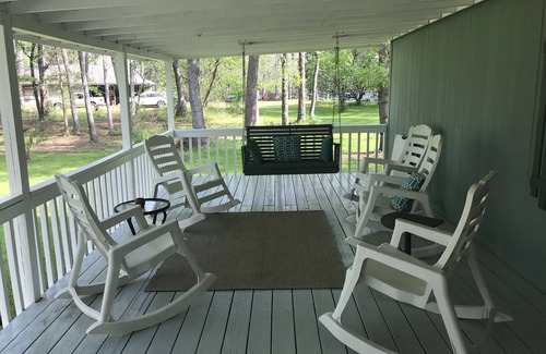 Lovely, peaceful views from 12’ x 54’ front porch for bird watching and gorgeous sunsets while rocking away the cares of the day. Outdoor lighting for croquet matches, corn hole and trampolining. Fire pit and grill for fireside roasting. Cozy and comfortable interior which easily sleeps 8 persons with two sitting rooms and two Smart TVs. Spacious kitchen equipped with coffee bar, microwave, air fryer, gas stove, large double sink and dishwasher