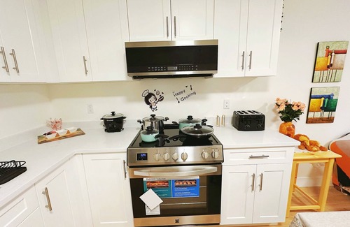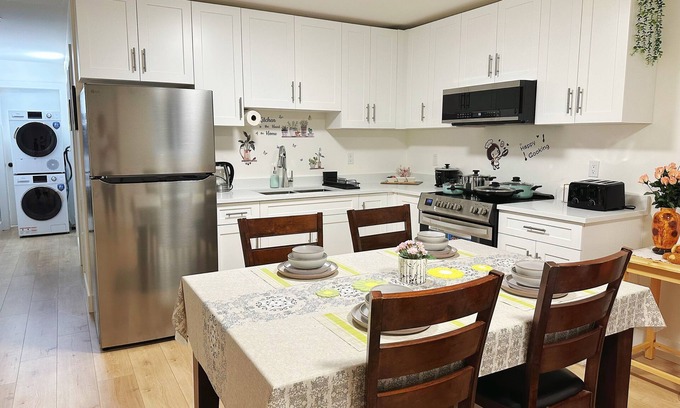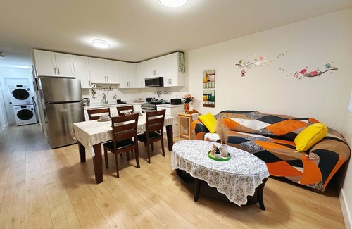 Welcome to our cozy 2-bedroom basement suite in the heart of Fleetwood! Perfect for families or groups of up to six, this charming suite features two comfortable queen beds, a sofa bed, and a fully equipped kitchen with modern appliances. The warm, inviting decor ensures a relaxing stay. Enjoy a peaceful neighborhood just minutes from two parks with trails, playgrounds, and sports courts. Whether for a short getaway or an extended stay, our suite combines comfort, convenience, and style.