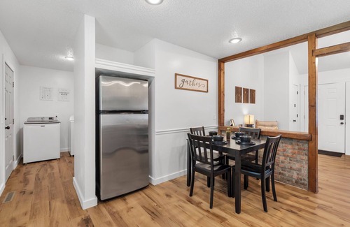 The fully stocked kitchen has everything you need: utensils for cooking, seasonings, coffee, tea, snacks, and a fridge stocked with fresh water and a variety of sodas. A full laundry room is also available for your convenience.