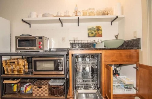 Kitchen: Fully stocked with a sink, dishwasher, full-size fridge/freezer, microwave, convection/portable oven, and two electric burners.