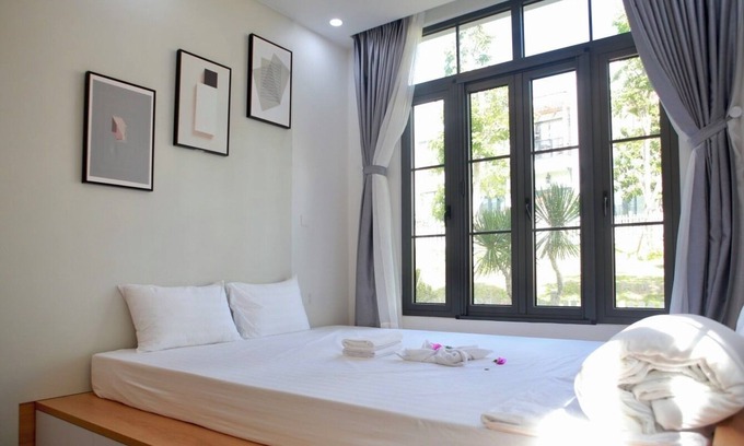 View hồ/view vườn kế sát hồ bơi đẹp nhất khu; gần biển (700 m di chuyển xe điện nội khu); 4 phòng ngủ/villa; 4-5 giường, 02 nệm thêm, Full máy lạnh; Bếp trang bị đầy đủ, lò BBQ và bàn ăn ngoài trời, 3 phòng WC và tắm trang bị đầy đủ; 02 xe đạp miễn phí/villa; xe điện miễn phí của Lê Gia; bãi biển Bikini (mặc đồ bơi) đẹp và sạch, có vòi sen tắm tráng; Wifi, đậu xe trước Villa; Gần các khu vui chơi Novaworld, gần biển (800m) - Lê Gia cung cấp vé giảm giá 25%.