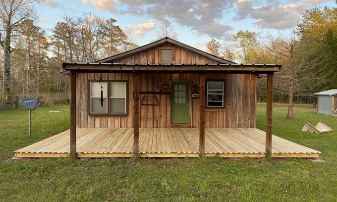 Quiet farm cabin off a dirt road in the pinneywoods. Nice kitchen and living room with two comfortable bedrooms and a small bathroom. Utility room includes washer and dryer. Wooden deck and a firepit for sitting outside, roasting s'mores, watching the stars, and listening for owls.