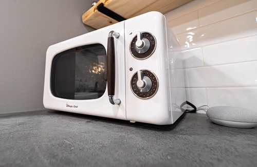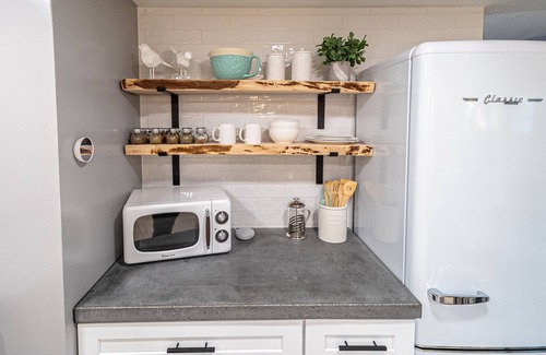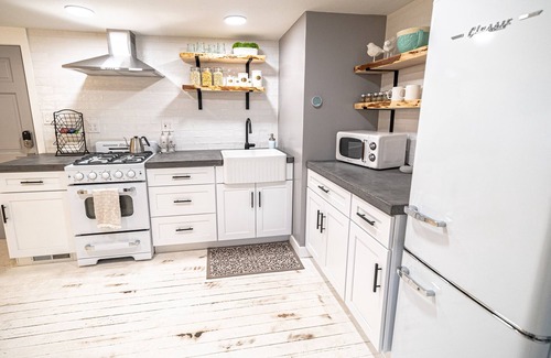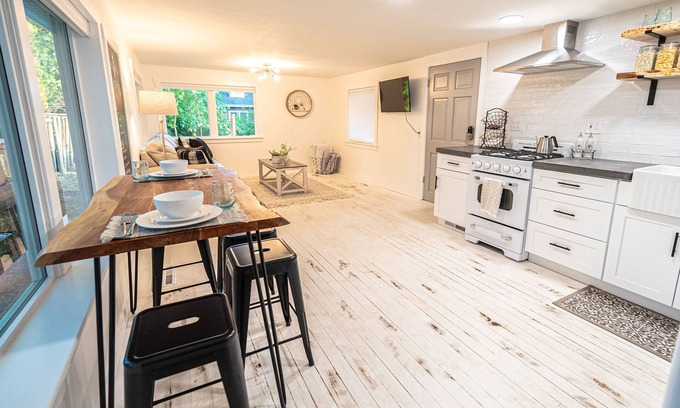 Newly renovated space featuring a rustic farmhouse style. Guests will enjoy the original hardwood flooring, refinished in a distressed white, and paired with new windows, cabinets, and fixtures. G-Nests are in the kitchen and bedroom for music and two phone charging pads are in the bedroom.