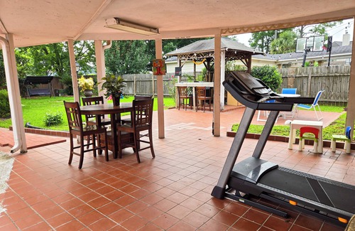 Welcome to your serene 1-bedroom garage apartment! Enjoy a cozy living space with a full kitchen, charming outdoor patio with a gazebo, grill, and patio set. Relax on the two-person swing, while kids play on the toy slide. Stay active with a treadmill and relish fresh fruits from our exotic trees, including pears, jujube, fig, and loquat. Blooming roses add to the beauty. Located in a peaceful neighborhood, just a block from H.E.B. and close to shops and restaurants. Your perfect getaway awaits!
