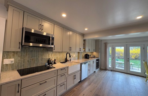 In addition to a fully stocked kitchen, dining and laundry area, the downstairs also has a living room with another bathroom, TV, two sofas and access to a serene, private patio. The dining area has a wood burning stove for winter nights that warms up the dining space.
