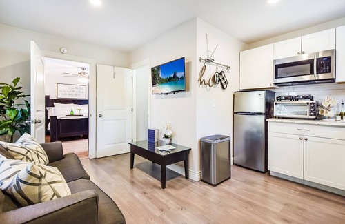 The spacious private bedroom is equipped with a King size bed, a closet with mirror, a dresser, an upright garment steamer, as well as a nightstand with a lamp, and an area for you to charge any electronics. The bedroom was designed for one queen bedroom. We do however provide two twin size air mattresses to accommodate additional guests. Just keep in mind it will be extra cozy in that room if you decide to utilize them.