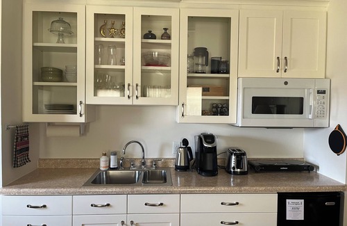 The kitchenette is equipped with amenities such as a mini-fridge, microwave/convection oven, infrared cooktop, toaster, Keurig, French Press and more. Whip up a quick breakfast or brew a cup of coffee while you plan your day's adventures.