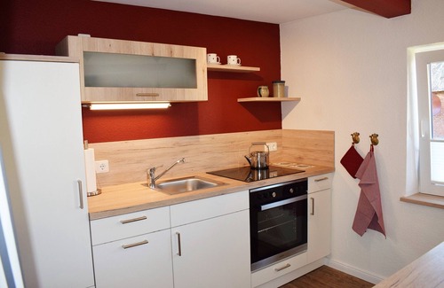 Upon entering Haushälfte Hanna, you are greeted by a warm and welcoming atmosphere. The open-plan kitchen seamlessly connects to the living room, allowing for easy interaction and socializing while preparing meals. The kitchen is well-equipped with modern appliances, including a refrigerator with a freezer compartment, a ceramic stove, an oven, a dishwasher, and essential kitchen utensils, making it ideal for culinary adventures. A dining table offers a great space to enjoy family meals or plan your day's activities.