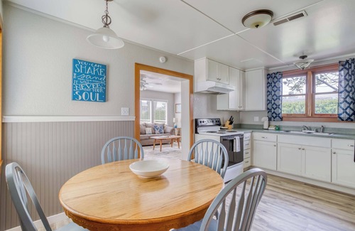 Sweet and neat, Gull’s Nest House puts you in a convenient location to experience Cannon Beach—just one block from the beach and three blocks from downtown shopping and dining. Clean and open, it’s a terrific launchpad for your North Coast adventures. Walk right out the door toward the beach access—views of Haystack Rock and miles of shoreline will greet you. Walk north up the block and shops, galleries, a bookstore and all kinds of food options will begin to appear. You’ll be happy to curl up next to the electric fire and watch TV in the living/dining room after a day of adventuring. The compact but fully equipped kitchen gives you options for dining in; you can also use the charcoal grill on the little fenced porch out front. Three sleeping spaces let you invite a friend or two on your trip to Cannon Beach. A quick car ride takes you to bustling Seaside or maritime Astoria; drive south to loads of hiking and secluded beach exploration. Have friends or family joining you? You can invite another couple to book Gull’s Nest Cottage right next door. You’ll love being so close to everything you come to Cannon Beach to enjoy!