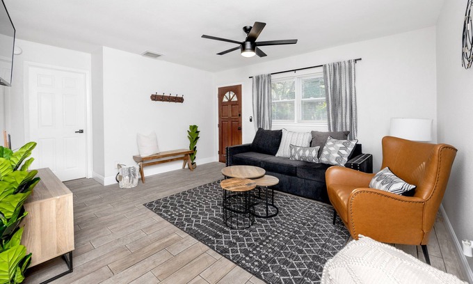 Relax with the whole family at this peaceful Largo getaway. Enjoy a stylish stay in our centrally located home, just minutes from Clearwater Beach, Indian Rocks Beach, Honeymoon Island, Dunedin, and St. Pete downtown. The modern décor features all brand-new furniture, a cozy tropical backyard, a coffee bar, and Smart TVs. With its bold boho theme, the space is clean, bright, and inspiring—perfect for your vacation or remote work needs.