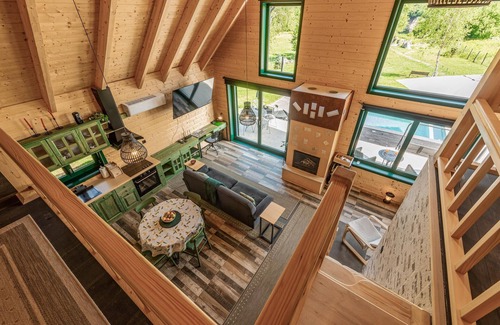 The modern house welcomes you in the middle of a beautiful landscape with a unique view and is the ideal place for a pleasant time with your loved ones. The stylish furnishings with beautiful wooden elements make it easy for you to relax here. An absolute highlight is the whirlpool in front of large windows, through which you can let your gaze wander over the surroundings. Make yourself comfortable in the evening on the inviting sofas by the crackling open fire.