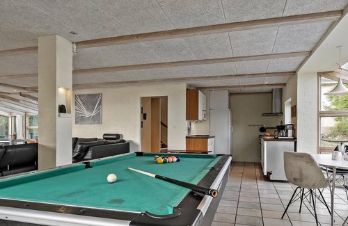 If you want to spend a wonderful holiday with a large family or lots of friends, this house is just right for you. A light-flooded living area with various large sofas offers plenty of space to relax together, watch TV or have a game night. You can prepare delicious meals in the kitchen and enjoy them at the long dining table. A pool table invites you to socialise and play cheerful duels.