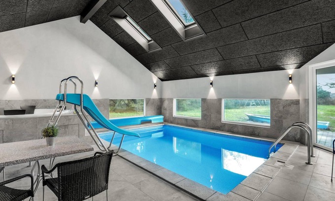 This gem of a house on 265 m² with two large sleeping floors with a total of 30 m² contains simply everything you desire. Here you can unfold, be active and relax. On a tour you will immediately come across the beautiful bathing area with the swimming pool and water slide, the whirlpool, the sauna and the separate bathroom with shower. Centrally placed you will find the kitchen-living room. In the kitchen you are provided with two stoves with ceramic hotplates, two built-in hot air ovens, two refrigerators/freezers and a dishwasher. In the activity room you really have a lot of opportunities to exercise your muscles: table tennis, pool and table soccer await you here. This house of course has a Playstation 2 and a free internet connection with 50/50 Mbit. The house is very spacious and offers plenty of room for 22 people in three separate sleeping areas with one bathroom per section. In addition, there are 2 spacious and high hems. On the large, undisturbed property with border vegetation has been thought of the younger guests with playground equipment, while you can spend cozy hours on the terrace.