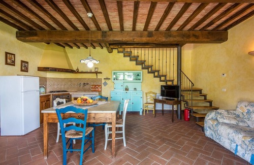 You will feel at home from the first moment in this house, which awaits you in the middle of Tuscan vineyards and is the ideal place for a nice stay with the whole family. Make yourself at home in the cozy rooms, the homely furnishings in country style, tiled floors and decorative wooden ceilings create a cozy ambience. In the evening, make yourself comfortable on the cozy sofa in the living area and make plans for the next days.