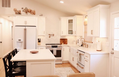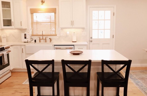 Gourmet Kitchen: Outfitted with beautiful Café appliances, a large farmhouse sink, and everything you need to prepare meals during your stay.