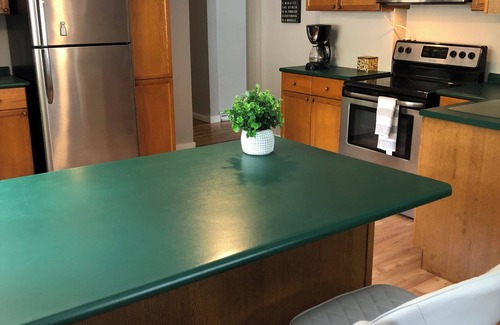 Prepare delicious meals in the functional kitchen, adorned with custom green countertops and stainless-steel appliances including an electric stove, dishwasher, and fridge. The kitchen comes stocked with essentials like a coffee maker with complimentary coffee and cooking basics. Gather around the spacious dining table with seating for six, where you can savor your culinary creations while soaking in the serene forestry views.