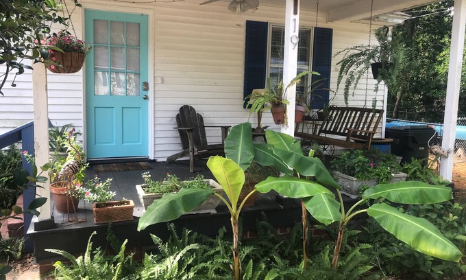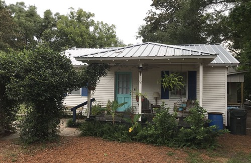 This cute 2 bedroom house with big fenced back yard and beautiful back porch is set among ancient live oaks draped in Spanish moss. The place could sleep 8, but I recommend no more than 4 adults. Two bedrooms (a queen size bed in one bedroom and two double beds in the other bedroom) and pull out sofa bed in the living room. Bed sheets are all organic cotton. There is one bathroom recently remodeled with nice tile shower. Other amenities available with the house include:
