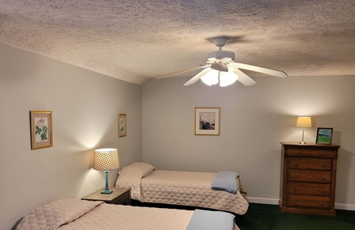 The wide stairway to the second level opens up to a large bedroom with two twin beds, dressers and a seating area. Although open to the stairs, the bedroom is situated to provide visual privacy from the first level. Off the bedroom is a full bath, a laundry room with washer and dryer, and a linen closet. The sleeping arrangements are ideal for couples, three adults, or parents with one or two children who can use the futon. One friendly dog is welcome if it meets the weight limits and breed restrictions set by our insurer.