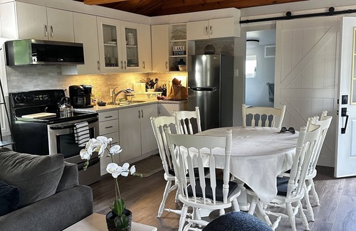 Our completely and newly renovated cottage features one Queen bed, 2 twin beds, a large and bright living room with a sofa , fully equipped eat in kitchen and one bathroom.