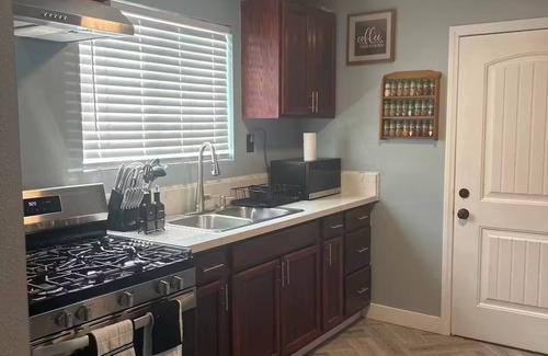 Two bedrooms with a queen bed in each room, a comfy recliner couch, Bathroom is basic with stand up shower equipped with plenty of towels, shampoo, conditioner, and body wash. In the kitchen, you’ll find basic cooking utensils, pots, pans and all basic needs (just please cleaning up after yourself. This home is listed as a guest house but is basically located at the front of the property with its own driveway. In the back houses there are long term tenants.