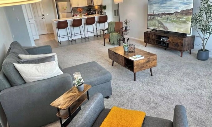 Experience your perfect getaway at this stylish, sunlit 2 bedroom 2 bathroom second-floor 1200 sqrt spacious apartment designed for relaxation and comfort. Enjoy the convenience of an attached garage for easy, secure parking. Seamless entry with smart access, just unlock your door using your smartphone. Convenient trash pickup service for a hassle-free stay. With thoughtfully curated mid-century brand-new furniture, a spacious open layout, and cozy touches throughout, this renovated home offers everything you need for a peaceful and productive stay. Relax in comfort on the plush sectional while watching your favorite shows on the 65” TV, cook in the fully equipped kitchen, or unwind in the tranquil master bedroom featuring a private workspace, spacious walk-in closet, and elegant double-sink vanities in the attached bathroom. Step out onto a private balcony with breathtaking valley views, where the scent of blooming garden flowers mixes with the soothing chirp of birds. Each bedroom features its own 40” TV for maximum comfort and entertainment. But the experience doesn’t stop indoors — you'll also have access to resort-style amenities including a sparkling pool surrounded by palm trees, a relaxing hot tub, a state-of-the-art 24-hour fitness center, poolside grills and a vibrant clubhouse perfect for socializing or working remotely. Whether you're traveling for business, a weekend escape, or an extended retreat, this space offers the perfect balance of luxury and livability.