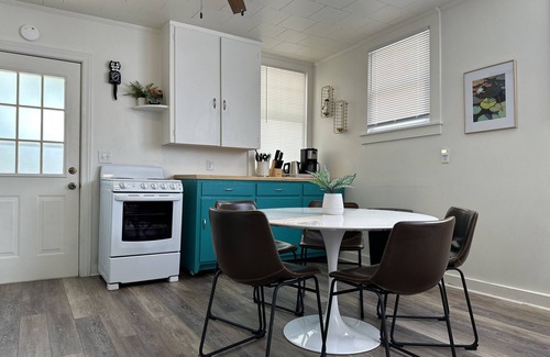 This cozy mid-century tiki inspired cottage on Oak Island is just a short walk to the beach and many dining options. After a day on the beach or fishing and kayaking off the dock at May Moore Park, relax and enjoy the retro charm and coastal cool that the cottage offers. The well stocked kitchen makes it easy to prepare meals to enjoy at the dining table or outside in the private backyard. This two bed, one bath retreat has an inviting living space with mid mod furnishings and pops of vibrant color.