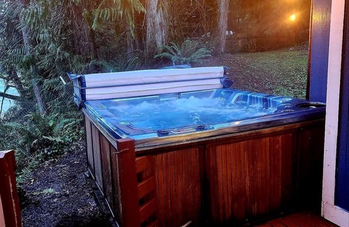 The space features wood-clad walls and exposed beams. Property is children and pet friendly. You’ll have the entire secluded property and cabin to yourself. Cabin was originally built as a fishing cabin back in the 1960’s. It’s since been recently fully remodeled. Inside you will find two bedrooms, one bathroom, one kitchen and a fireplace. The cabin sleeps six individuals with queen beds in both bedrooms and couch with a queen pull out. Outside you will have a large deck overlooking Canyon Creek which offers stunning views, fishing, swimming, floating, kayaking and rafting. There is a dedicated fire pit in the yard with lawn chairs provided. We also have a propane fire pit that’s located under the covered area on the back deck. We offer a jacuzzi hot tub that overlooks Canyon Creek where you can soak away your troubles and soreness while listening to the river rushing beneath the stars.