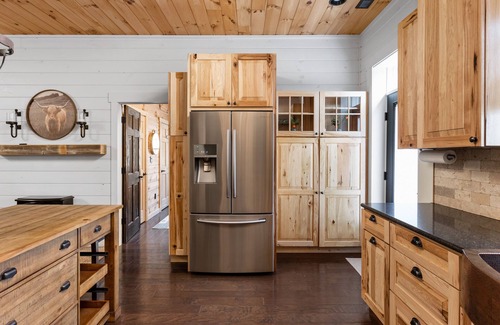 Your favorite room might just be the fully equipped kitchen, perfect for preparing meals and making memories. The large brass kitchen farm sink makes dishwashing a breeze, and the Magnolia kitchen island (from Texas!) is ideal for extra seating while you cook. We’ve got all the tools you need for your culinary creations – crockpot, blender, mixer, pots and pans, cookie sheets – and a coffee bar to brew your favorite cup of joe! Don’t forget to enjoy your drink in our signature Cozy Cabins mugs.