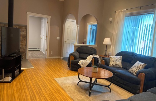 Forget your worries in this spacious and serene space. Come relax in our 2 bed 1 bath tucked away home. We have a full kitchen and appliances with an open concept dining room flowing into a vaulted ceiling living room. Each room is furnished with queen beds, but also holds plenty of closet space. Jetted jacuzzi and a large vanity complete 1000sq feet suite. We are 12 min from the center of Delta Junction.