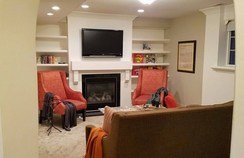 This basement apartment is full of daylight and has a large utility room with kitchenette and laundry. Included appliances are a fridge/freezer, micro-convection oven, coffeemaker, Instapot, toaster and washer/ dryer. Seating for 6 combine at the nook table and the butcher block island bar. An additional folding table for 4 and extra chairs are also available in the under-stairs storage. The utility room has fun connecting puppet theatre windows to a cozy family room with mud room access to a fully-fenced backyard, allowing space for kids to play or an “al fresco” dinner on the patio.