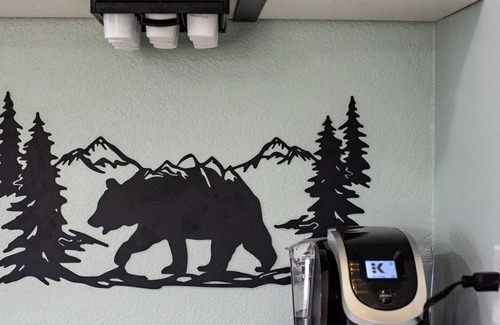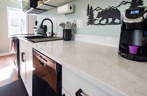 The kitchen is equipped with everything you need to make some delicious meals (or maybe just coffee!) during your stay. Stylish open-shelving makes it easy to find what you need, and the cabinets and drawers are labeled for your convenience. There is a Keurig coffee maker with complimentary K-cups, along with a reusable K-cup to fill with your favorite coffee. We also provide a hot water kettle, tea, cream, sugar, and sugar free sweetener.
