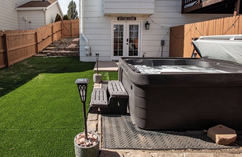 The private basement opens to a cozy fenced in yard with a 5-person hot tub (with easy-open cover lifter, colorful lights, waterfall, and a compartment for warmed towels), brand new turf, a corn-hole set (stored in the laundry room), and patio string lights. Enjoy coffee on the patio in the morning sun, a meal and yard games in the afternoon, or end your day of adventuring with the steaming hot tub lit by the gentle glow of the market lights and Colorado stars.