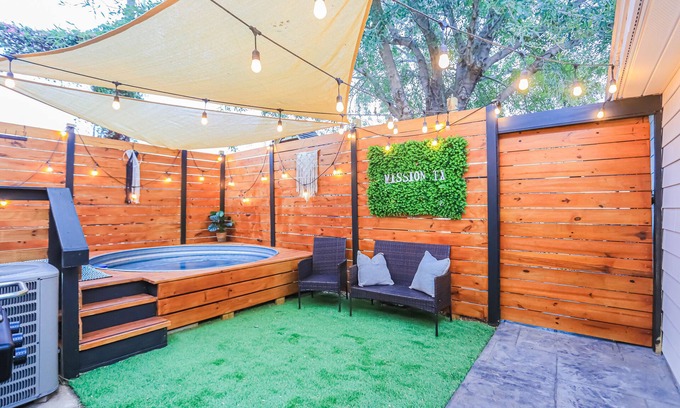 Features a private backyard deck for entertainment, string lights throughout, a Gas grill for carne asada nights, 4 chairs for seating, 1 bench, an 8 ft. stock tank pool, outdoor games and greenery decor for those Selfie moments!