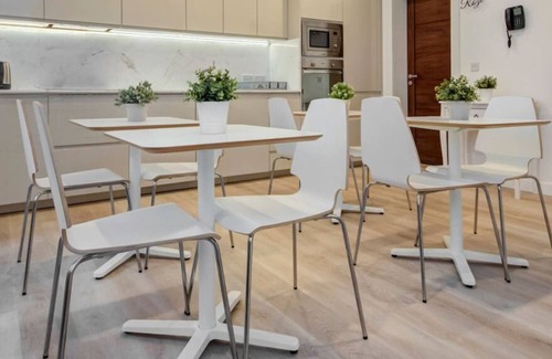Communal Area| Guests have access to a shared kitchen, fully equipped with modern appliances for all your cooking needs. The common area includes tables and chairs, perfect for enjoying meals or chatting with fellow guests.