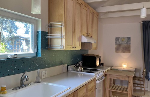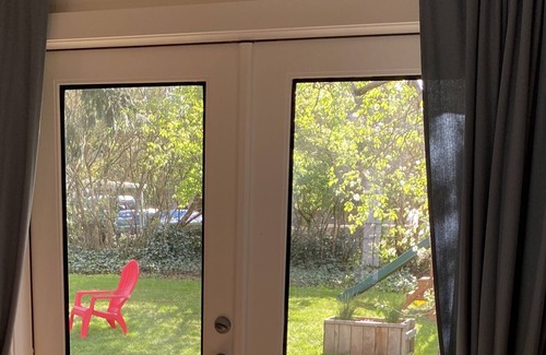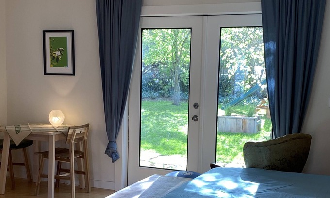 This sweet newly built studio cottage sits in a huge garden behind my home and beneath tall fir trees. A perfect quiet retreat, it has bamboo floors, a secluded back terrace, a queen sized bed, full kitchen, and fast wifi.